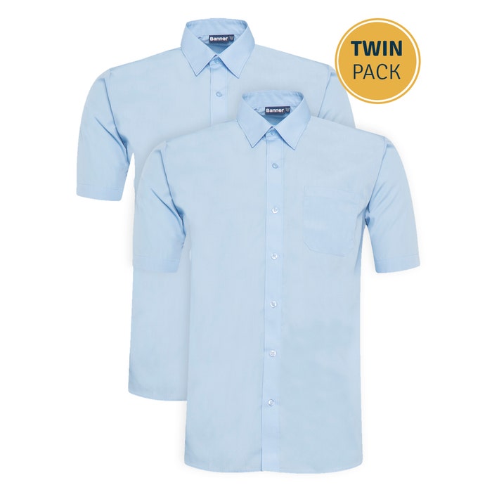 <p>Get your child ready for school with this handy slim fit twin pack of boys’ short sleeve school shirts – a great choice for warmer days or all-year layering. Made from a soft, sustainable mix of 65% recycled polyester and 35% cotton, these shirts are lightweight, breathable, and non-iron. Featuring a classic button-up design, chest pocket, and easy fasten closures on smaller sizes (12.5" collar and under), they combine comfort with everyday practicality. From one of the UK’s most trusted schoolwear suppliers, Banner ensures quality and value with 100% recycled, recyclable packaging.</p>