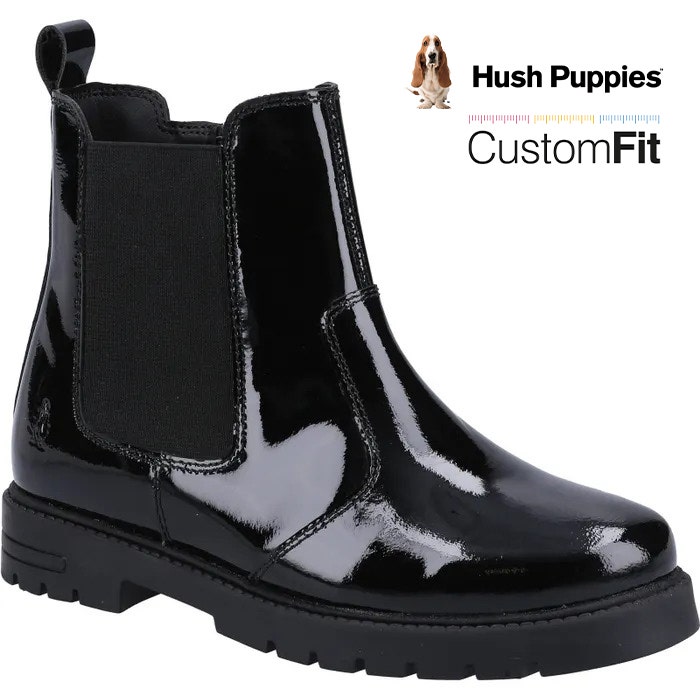 <p>The Hush Puppies Laura School Boot delivers the perfect mix of smart school style and day-long comfort. With its on-trend patent finish, stitched rand detail, and classic Chelsea boot silhouette, it’s a stylish choice that still stands up to busy school days. Designed for ease, Hush Puppies Laura features an inside zip and pull tab for quick slip-on, slip-off wear – great for independent dressers and busy mornings. The treaded sole and sturdy outsole offer dependable grip and durability, while the Custom Fit system ensures a tailored fit with up to five width options, thanks to the three pairs of included footbeds.</p>
