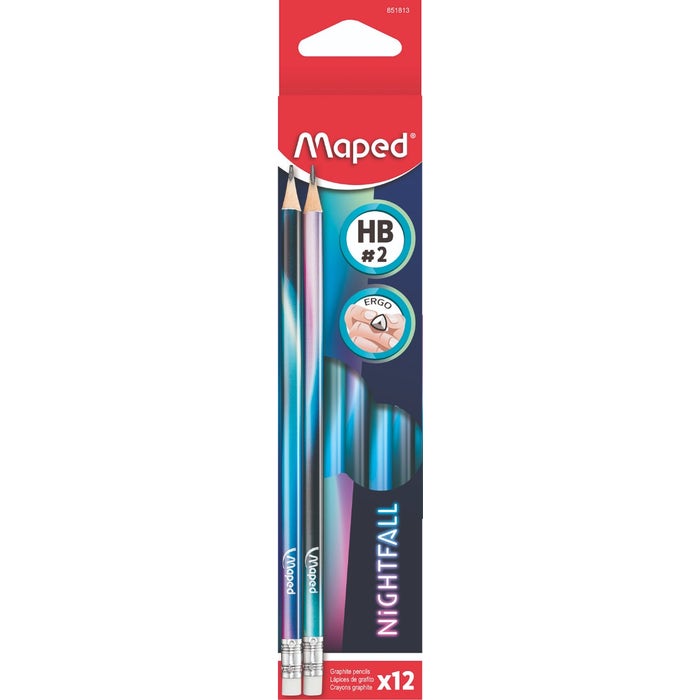 12 x HB pencils Colourful nightfall design Triangular ergonomic shape Improved grip Integrated eraser head For help in choosing the right product please see our size guide product